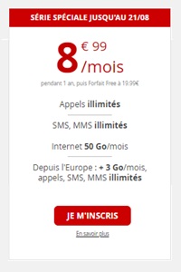 Free vous permet également de profiter d'une belle promotion pour votre forfait sans engagement. L'opérateur propose en effet jusqu'au 21 Août inclus, une série spéciale avec 50Go de data à seulement 8.99€ par mois les 12 premiers mois. Une fois la promotion terminée, vous basculerez ensuite sur le Forfait Free à 19.99€/mois ou encore à 15.99€ par mois avec une offre Freebox.