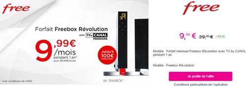 - Non abonnés d’une offre fixe de Free (Freebox ou Alicebox) dans les 30 jours qui précèdent cette souscription. A défaut, des frais de réactivation de 100€ et un passage immédiat au Forfait Freebox Révolution avec TV by CANAL Panorama à 39,99€/mois seront appliqués à l'abonné.