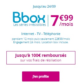 La série BBOX irrésistible lancée le 16 juillet dernier est une fois prolongée. Cette box à petit prix est en effet en promo à 7.99€ par mois la première année jusqu'au 24 septembre inclus. Vous avez donc quelques jours suppléntaires pour profiter de cet abonnement Internet haut débit à moins de 10€ par mois la première année, box incluse. L'opérateur offre également les frais de mise en service habituellement facturés 29€. Si vous changez de FAI pour Bouygues Telecom, vos frais de résiliation pour votre abonnement Internet actuel seront remboursés jusqu'à hauteur de 100€ par l'opérateur.