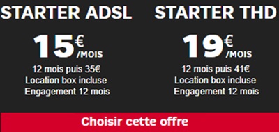 La BOX Starter profite jusqu'à 22€ de remise par mois la première année. Cet abonnement Internet SFR soumis à un engagement de 12 mois est affiché à 19€ par mois la première année en version Fibre ou encore à 15€ par mois par ADSL. Ces prix sont valables durant la première année, une fois la promotion terminée, la formule Starter Fibre repasse a son tarif habituel de 41€ par mois ou encore à 35€ par mois par xDSL, BOX incluse.