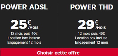 Autre formule en promo chez SFR, la BOX Power Fibre ou ADSL. L'opérateur vous offre jusqu'à 17€ de remise la première année. Cette BOX est affichée à 29€ par mois puis 41€ en Fibre ou encore à 25€ par mois puis 40€ par mois par ADSL, box incluse. La formule Power est également soumise à un engagement de 12 mois.