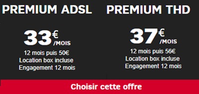 L'offre Box Premium de SFR est disponible à 33€ par mois pendant un an puis 50€ en version ADSL. En version Fibre, cet abonnement Premium est affiché à 37€ par mois pendant un an puis 56€ par mois. La location de la Box est incluse dans ce tarif. Cette formule Premium est soumise à une période d’engagement de 12 mois.
