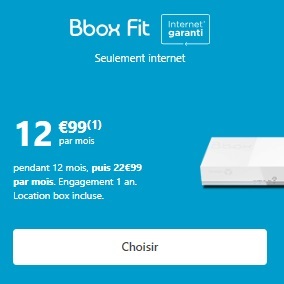 L’abonnement Bbox Fit est en promo à 12.99€ par mois la première année box incluse. Une fois les 12 premiers mois écoulés, la BBOX Fit repassa à son tarif habituel de 22.99€ par mois. Cet abonnement BOX sans TV en promo à moins de 12€ est valable sous réserve d’éligibilité en zone dégroupée par Bouygues Telecom. L'opérateur vous permet de bénéficier de ce tarif de 12.99€ par mois en zone dégroupée étendue, toutefois, au bout des 12 mois, la BBOX Fit étendue est facturée 30.99€ par mois.