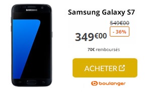 Le Samsung Galaxy S7 revient à 279€ au lieu de 549€ ce Week-end chez Boulanger. Le marchand vous permet d'économiser 200€ à la commande et le constructeur vous rembourse 70€ sur demande. Pour profiter de la réduction proposée par Boulanger, vous n'avez aucune démarche à faire, la remise de 200€ est appliquée automatiquement à la commande. Le Galaxy S7 est ainsi facturé 349€ à l'achat. Ce mobile profite aussi d'une remise différée de 70€ en complétant et en renvoyant le formulaire mis à disposition chez le marchand. L'ODR de 70€ est valable jusqu'au 18 novembre.