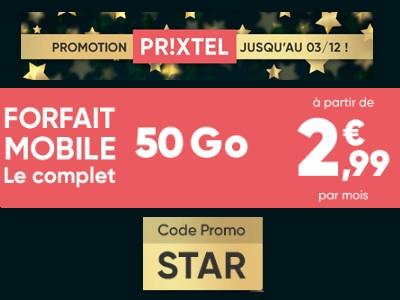A partir de maintenant et jusqu'au 3 décembre inclus, le MVNO Prixtel nous fait la belle surprise de mettre à disposition un code promo permettant de déduire 7 euros par mois sur les 3 paliers de sa gamme de forfait mobile Le Complet normalement facturée à partir de 9,99€.