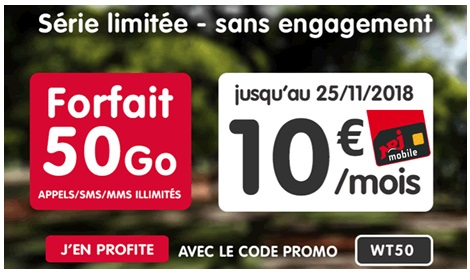 Le MVNO NRJ Mobile propose un super plan valable jusqu'au Black Friday. Vous pouvez en effet saisir la Série Limitée avec 50Go de data à 10€ par mois à VIE avant le 25 novembre inclus. Pour profiter de la remise de 10€ par mois, vous devez renseigner le code promo WT50 lors de la commande. La carte SIM est facturée 5€ à la commande.
