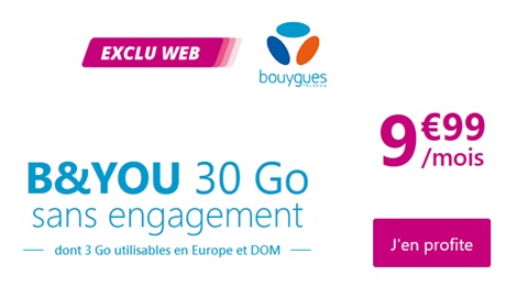 Bouygues Telecom propose aussi une offre sans engagement avec 30Go de data au prix fixe de 9.99€ par mois et ce jusqu'au 27 novembre inclus. Cette offre en exclu Web est valable dans le cadre d'une nouvelle ouverture de ligne et la carte SIM est facturée 10€ à la commande.