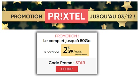 Le MVNO Prixtel quant à lui vous permet de profiter d'une remise de 7€ par mois pendant 6 mois. Cette offre est valable sur l'ensemble des paliers de l'offre ajustable de l'opérateur. Ce dernier vous permet aussi de sélectionner votre réseau avec au choix celui de l'opérateur SFR ou celui d'Orange. Le premier palier avec les appels, illimités, SMS et MMS illimités et 5Go de data est ainsi affiché à 2.99€ au lieu de 9.99€. Le second avec 15Go de data est affiché à 7.99€ par mois au lieu de 14.99€ Et enfin, l'offre Prixtel avec 50Go de data est au prix promo de 12.99€ au lieu de 19.99€. Pour bénéficier de la réduction, il faut renseigner le code PROMO STAR dans le champ prévu à cet effet.