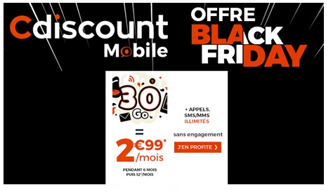Cdiscount propose à compter de ce jeudi 22 novembre, une offre spéciale Black Friday. Il s'agit d'un forfait sans engagement avec 30Go de data à 2.99€ par mois pendant 6 mois. Pour bénéficier de la réduction de 9.01€, il faut renseigner le code promo BF18 lors de la saisie de la commande. A l'issue des 6 premiers mois, ce forfait pas cher passe au prix attractif de 12€ par mois. La carte SIM est facturée 10€ à la commande.