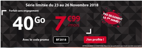 Jusqu’au 26 Novembre prochain, l’opérateur mobile Auchan Telecom propose un forfait spécial Black Friday avec 40Go de data au prix de 7.99€ par mois sans engagement. Le prix promo est valable sans condition de durée, autrement dit, à VIE ! Pour profiter de cette série spéciale, vous devez renseigner le code promo BF2018 lors de la commande à l'étape 5. Cette offre promotionnelle est réservée aux particuliers pour toute nouvelle souscription.