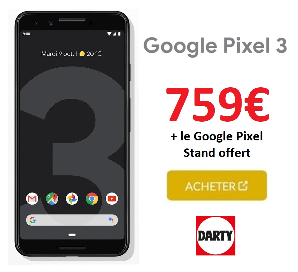 Le Google Pixel 3 est sortie le 1er novembre en France. Il s’agit du premier smartphone de Google vendu dans l'héxagone. Pour acquérir les anciens modèles, il fallait obligatoirement les importer d’autres pays. Le Pixel 3 est vendu aujourd’hui chez Darty à 759€ avec 100€ de réduction. De plus, le Google Pixel Stand (d’une valeur de 79,99€) vous est offert ! Cette station de recharge sans fil possède des fonctionnalités innovantes pour le réveil par exemple et intègre l'assistant Google.
