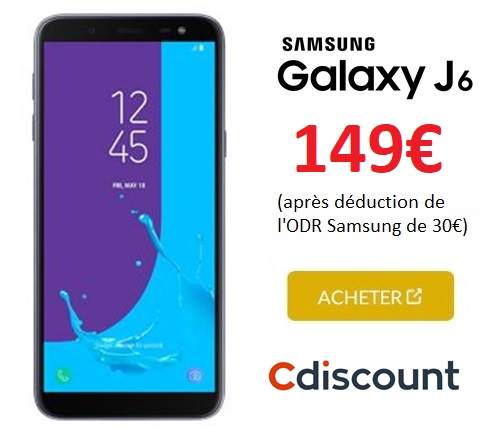 Le Samsung Galaxy J6 profite d’une jolie réduction sur le site de Cdiscount. Affiché à 179€, le prix du smartphone tombe à 149€ après l’application de l’ODR Samsung. La livraison à domicile et en point-relais est offerte par Cdiscount.