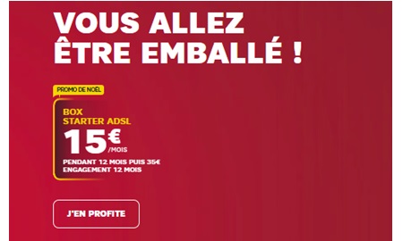 L’heure est aussi aux remises chez SFR qui propose des prix ultra avantageux sur sa Box Starter ADSL. En effet, celle-ci est proposée à 15€ par mois pour les 12 premiers mois d’abonnement au lieu de 35€/mois (avec engagement de 12 mois). Ce forfait vous offre la possibilité de vous connecter à Internet en profitant de l’ADSL avec un débit descendant allant jusqu’à 20 Mb/s et un débit ascendant allant jusqu’à 1 Mb/s. De quoi profiter efficacement de tous vos sites favoris.