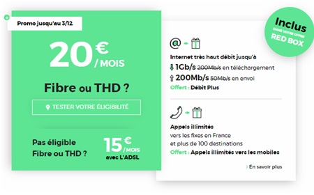 En promo jusqu’au 3 décembre 2018, la Box ADSL Red by SFR est proposée à 15€/mois (20€ pour la Fibre) et comprend de nombreux services : Internet en haut débit, les appels illimités vers les fixes en France et plus de 100 destinations, les appels illimités vers les mobiles, mais également bon nombre d’options TV à la carte : un décodeur de plus de 35 chaînes (2€/mois), un décodeur de plus de 100 chaînes (4€/mois). A découvrir de toute urgence !