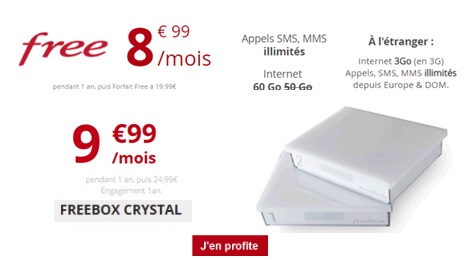 En couplant votre abonnement Free Mobile 60Go à la Freebox Crystal à 9,99€/mois ou la Freebox Révolution, actuellement sur Vente Privée à également 9,99€/mois, vous bénéficiez d’une remise exceptionnelle !