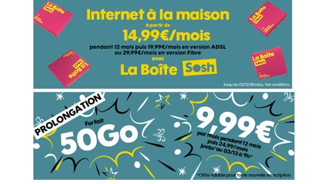 Un forfait SOSH 50Go à 9,99€, accompagné de sa Box ADSL ou Fibre à 14,99€ !