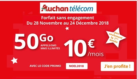 La promo Auchan Telecom : 50Go avec appels + SMS/MMS illimités à 10€ par mois à VIE. Offre sans engagement valable jusqu’au 24 décembre inclus