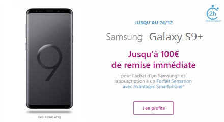 Bouygues Telecom ne lésine pas sur les promotions, notamment en ce qui concerne le Samsung Galaxy S9+. En effet, avec le code PROMO50, ce terminal est disponible à 129.9€, puis 8€ par mois pendant 24 mois en plus de l'abonnement (23.99€ par mois pendant 12 mois puis 38.99€ la seconde année). Simplement, il suffira de renseigner au moment de l’achat le code promo et de sélectionner le forfait Sensation 70Go (engagement de 2 ans). Le Galaxy S9 Plus bénéficie aussi d’un bonus de 100€ dans le cadre de la reprise de votre ancien mobile. Dans ce cas, il vous faudra débourser 23.99€ par mois pendant 12 mois puis 38.99€ la seconde année.