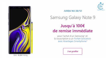 Vous souhaitez offrir à un proche l’un des derniers Samsung du marché à prix canon ou vous le procurer tout simplement ? A l’approche de Noël, Bouygues Télécom propose, jusqu’au 26 décembre, une vente flash exceptionnelle avec une remise immédiate de 100€ pour l'achat d’un Samsung Galaxy Note 9 (code promo PROMO100) et de 50€ sur le Samsung Galaxy S9+ (code promo PROMO50). A cela s’ajoutent d’autres éléments, vous permettant d’économiser lors de l’achat : un Bonus de reprise de votre ancien mobile, ainsi qu’un tarif unique de 8€ par mois pendant 2 ans. A découvrir de toute urgence !