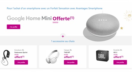 A noter que d’autres promotions Bouygues Télécom et B&YOU déferlent actuellement sur le site de l’opérateur. Par exemple, il est possible de bénéficier de la vitesse de la fibre à prix d’amis (17.99€ par mois pendant 12 mois puis 32.99€ par mois. Une série spéciale mobile B&YOU 40Go sans engagement est également affichée au tarif de 9.99€ mensuel. Enfin, pour l’achat d’un Smartphone avec forfait « Sensation », vous pouvez vous voir offrir des cadeaux pour toute la famille : le dispositif Google Home Mini, ainsi qu’un accessoire au choix (des écouteurs JBL, un casque JBL ou une enceinte JBL).