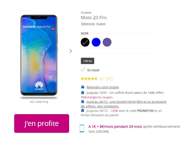 Avec un forfait 50Go (24.99€/mois pendant 1 an puis 39.99€/mois pendant 12 mois), vous paierez le Smartphone Mate 20 Pro 349.9€ +8€/mois pendant 2 ans.