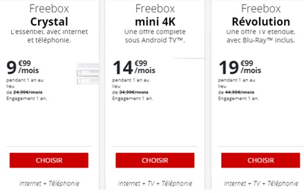 Le forfait Freebox Révolution à 19,99 €/mois pendant 1 an, puis 44,99 €/mois. Engagement 1 an. Offre valable jusqu’au 01 janvier inclus
