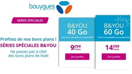 Les forfaits B&You 40Go à 9.99€ et 60Go à 14.99€ prolongés jusqu’au 2 janvier inclus.