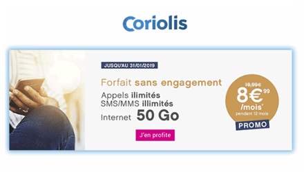 Le MVNO Coriolis offre une remise de 11€ par mois pendant 1 an sur son forfait Brio Liberté avec 50Go de data. Cet abonnement sans engagement est affiché à 8.99€ par mois pendant 12 mois et ce jusqu'au 31 janvier 2019. La carte SIM est facturée 1€ à la commande.