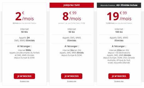 Pour rappel, à son lancement, le forfait Free Mobile à 19.99€ bénéficiait des appels illimités vers 40 destinations, les SMS/MMS illimités et Internet illimité (3Go). Le forfait à 2€ incluait quant à lui 60 minutes et 60 SMS. Aujourd’hui, ces derniers se sont enrichis et le moins cher comprend entres autres, 2h d’appels, les SMS et MMS illimités et 50Mo de data en France métropolitaine + 50Mo depuis Europe et DOM. Rappelons que depuis le 12 juillet 2018, Free propose en série limitée un forfait intermédiaire avec 50Go de data au prix promo de 8.99€ par mois pendant 1 an.