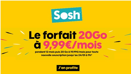 Face aux bas prix pratiqués actuellement sur le marché de la téléphonie mobile pour les soldes 2019, l’opérateur mobile Sosh (by Orange) lance ce lundi 14 janvier une nouvelle offre promotionnelle sur son forfait sans engagement doté d'une enveloppe Web de 20Go par mois. Jusqu’au 24 janvier 9h, la marque 100% digitale d'Orange vous permet d'économiser 10€ par mois pendant 1 an pour toute nouvelle souscription au forfait SOSH 20Go. Cet abonnement sans engagement est ainsi affiché à 9.99€ la première année, à l'issue des 12 premiers mois, l'offre repasse à son prix habituel de 19.99€ par mois. Autre indication, cette offre n’est pas valable pour les clients en migration depuis une offre SOSH ou Orange.