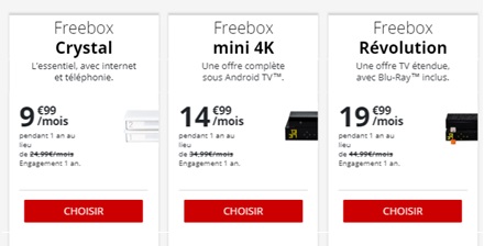 - La Freebox Crystal en version ADSL est affichée à 9.99€ par mois au lieu de 24.99€ par mois,