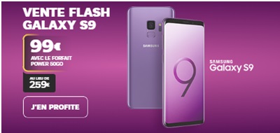 Grâce à la vente flash et en optant pour le forfait Power SFR 50Go, les clients profitent d'un prix canon pour se procurer le Galaxy S9 ou la version plus. En effet, le Galaxy S9 est disponible à 99€ au lieu de 259€ et le Samsung Galaxy S9+ à 199€ au lieu de 369€. Pour profiter, il ne reste beaucoup plus de temps, cette vente flash est disponible jusqu'à ce soir 23h59.
