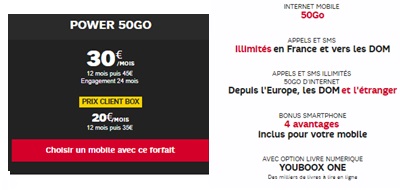 Le forfait Power 50Go est affiché à 20€ par mois pendant 12 mois puis 35€ chez SFR à condition de détenir une BOX Internet SFR et avec l'achat d'un Smartphone. Sans achat de mobile, ce même forfait est proposé à 10€ par mois pendant 1 an puis 25€ par mois. Ces tarifs sont valables pour les clients détenteurs d'une BOX SFR. Il est tout à fait possible de profiter de ces remises spéciales clients en souscrivant dès à présent à une BOX Internet SFR. Les forfaits BOX sont aussi en promo la première année avec les tarifs suivants :