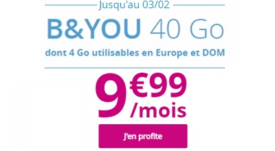 Bouygues Telecom propose lui aussi une offre sans engagement à prix fixe. La formule est plus généreuse que celle de RED by SFR avec 40 gigas de data par mois contre les 30Go chez le concurrent. Cette offre est proposée au prix canon de 9.99€ par mois jusqu'à sa résiliation. En effet, cette promo est valable sans condition de durée et réservée aux nouveaux clients. La carte SIM est aussi facturée à 10€ à l'enregistrement de la commande via le site web de Bouygues Telecom. Pour en profiter, vous devez faire vite, ce forfait B&You en promo s'arrête le 3 février inclus.