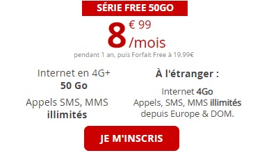 La Série Free Mobile est la plus attractive avec son prix mini de 8.99€ par mois et une enveloppe Web de 50Go. Toutefois, son tarif promotionnel est valable uniquement la première année contrairement aux formules précédentes. Vous bénéficiez en effet la première année d'un volume internet de 50 Go à 8,99€ par mois. Au bout des 12 mois, l'offre bascule automatiquement sur le forfait le plus complet de l'opérateur avec ses 100 Go de data à 19,99€ par mois ou 4G+ illimitée à 15.99€ par mois pour les clients équipés d'une Freebox. Cette offre canon est disponible jusqu'au 12 février inclus. Concernant les modalités, les abonnés Free qui ont adhéré à un forfait de l'opérateur dans les 30 jours qui précèdent cette souscription ne peuvent pas en bénéficier. La carte SIM coûte 10€.