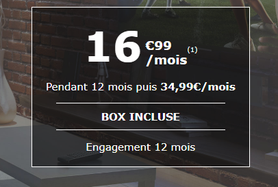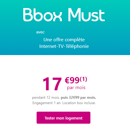 Bouygues Télécom n’est pas en reste avec son offre Bbox Must Fibre optique et triple play à 17.99€/mois pendant un an. Dès le 13ème mois, elle retournera à son tarif de base : 32.99€/mois.