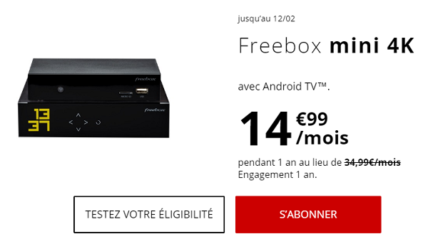 Free est toujours là côté bon plan et vous propose actuellement sa Freebox Mini 4K en promo à 14.99€ par mois pendant 12 mois. Suite à la période promotionnelle, elle retourne à son prix de base, à savoir 34.99€ par mois.