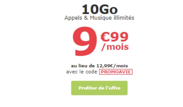 L'opérateur propose aussi un bon plan pour les personnes qui cherchent une offre avec des appels illimités et une enveloppe data correcte pour profiter des fonctionnalités de leur Smartphone. En effet jusqu'au 10 février inclus, la formule 10Go avec appels, SMS et MMS illimités au prix de 12.99€ par mois passe à 9.99€ par mois. Cette réduction de 3€ par mois est valable avec le code PROMOAVIE. Grâce à ce code à renseigner à la commande, les nouveaux clients profitent d'un prix canon jusqu'à la résiliation de l'abonnement. La carte SIM payable à la commande coûte 9.90€.