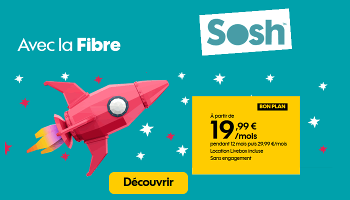 Avec ce forfait Boite SOSH en promo, c’est une remise de 10 €/mois pendant les 12 premiers mois qui vous est offerte ; soit 120 € sur le montant de votre facture sur la première année. Vous payez ainsi le même prix qu’un abonné ADSL, mais pour un débit internet beaucoup plus élevé : jusqu’à 300 Mb/s en téléchargement comme en envoi. SOSH vous offre par ailleurs les frais de raccordement à la fibre optique, et bien entendu, la Livebox 4, dont la location est incluse dans ce prix.