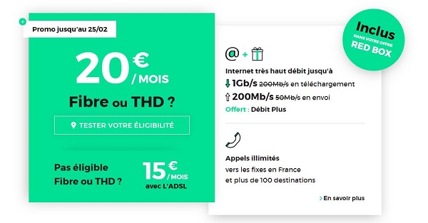 RED by SFR propose un forfait Box Internet sans engagement pas cher. Pour 20€ par mois uniquement, on accède à la Fibre optique jusqu’à 1Gb/s. Si vous n’êtes pas éligibles à cette dernière, il est possible d’accéder à l’ADSL pour un prix de 15€ par mois seulement. Dans les deux cas, il s’agit de prix fixes, valables à VIE.