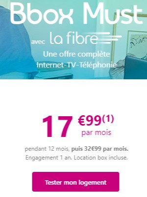 Bouygues Telecom vous permet de vous équiper de sa BBOX Must Fibre à 17.99€/mois pendant un an. Dès le 13ème mois, cette offre reprend son tarif de base de 32.99€/mois.
