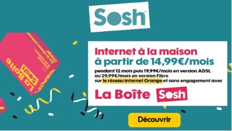 Sachez que si vous cherchez une BOX Internet sans engagement de durée à petit prix, Orange vous permet par le biais de sa marque 100% en ligne de vous équiper de la Fibre à 14.99€ par mois la première année (puis 29.99€ par mois). La boîte SOSH en plus d'être sans engagement est sans frais de location de BOX et sans frais de mise en service.