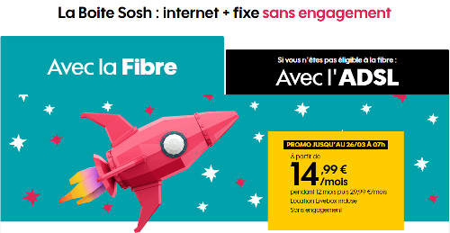 Jusqu’à ce 26 mars à 7h, l’ADSL et la fibre sont au même prix pendant les 12 premiers mois chez SOSH : 14,99 €/mois. Ensuite, le tarif passe à 19,99 €/mois pour les abonnés ADSL, et à 29,99 €/mois pour les abonnés fibre.