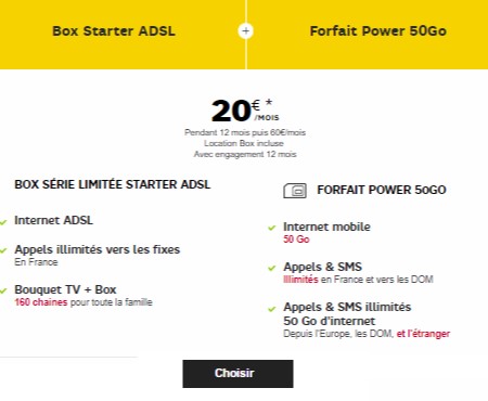 Le pack SFR dès 20€/mois : BOX Starter Fibre ou ADSL + Forfait Power 50 Go