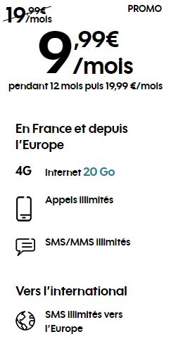 De plus, pour les utilisateurs en Europe, la formule permet d’appeler et d’envoyer des SMS/MMS illimités vers la France, l’Europe, la Suisse, Andorre et les DOM. En outre, elle propose toujours les 20Go d’Internet mobile, comme en France.