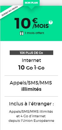 Le forfait mobile de RED by SFR propose donc 10Go de données mobiles en ce moment, au lieu de 1Go. Ces datas sont accessibles en 4G en France métropolitaine. En plus de cela, il dispose des communications illimitées en France métropolitaine (SMS, MMS et appels) ainsi que tout illimité depuis l’UE et les DOM vers la France.