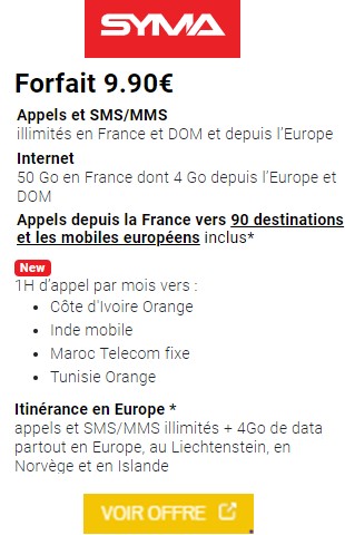Syma Mobile se démarque avec son offre proposée sans engagement certes mais aussi sans condition de durée. Au prix de seulement 9,90€ par mois, vous bénéficiez d'une offre généreuse avec un volume data riche de 50 Go et la téléphonie illimitée. Et vous profitez surtout d'un prix bas à vie tant que vous restez client.