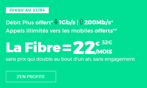 Cette super promo expire ce 23 avril à 23h59 ! Pas de temps à perdre donc si vous souhaitez profiter du meilleur de la fibre optique du réseau SFR sans engagement et avec deux gros bonus offerts. Avec ce bon plan, vous avez en effet une connexion Internet boostée jusqu’à 1 Gb/s en téléchargement et 200 Mb/s en envoi, grâce à l’option Débit Plus qui est offerte gratuitement. Pour vos appels, vous bénéficiez de l’illimité vers les fixes de France (métropole et DOM) et de plus de 100 destinations, mais aussi vers les mobiles de tous les réseaux de France métropolitaine et des DOM (sauf Mayotte). Cela est possible grâce à une deuxième option offerte gratuitement par l’opérateur. Pour ce qui est de la télévision, elle est proposée ici en option à partir de 2 €/mois.