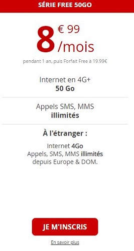 - Couverture 4G+ 50Go en France métropolitaine (débit réduit au-delà)