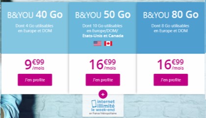 L'opérateur Bouygues Telecom propose trois forfaits B&You dotés d'enveloppes confortables de 40 Go, 50 Go et 80 Go avec l'illimité pour vos communications (appels, SMS/MMS). Vous pouvez acquérir ces forfaits mobiles attrayants aux prix promotionnels de 9,99€ par mois pour le plus petit abonnement et 16,99€ par mois pour les formules 50 et 80 Go de data. Notez que vous bénéficiez avec ces offres B&You de la liberté du sans engagement et des tarifs qui n'évoluent pas au terme de la première année de votre abonnement.
